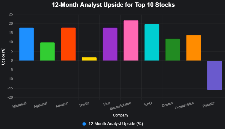 The chart below projects the 12-month analyst upside for each stock, highlighting near-term growth expectations. This aligns with the table and narrative, emphasizing companies with strong analyst confidence (e.g., MercadoLibre, IonQ) while noting outliers like Palantir’s negative outlook, which may be undervalued given its fundamentals.