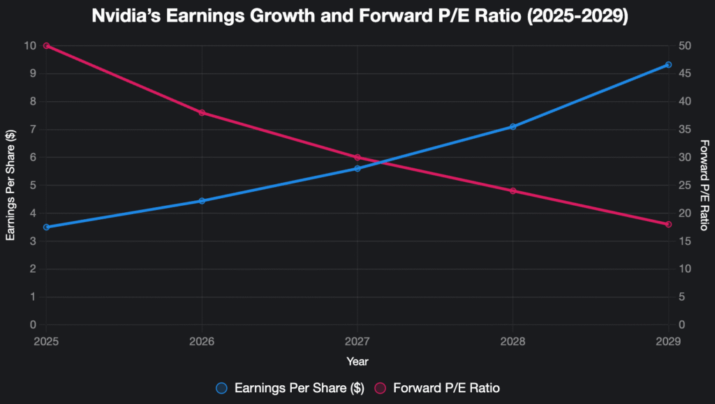 Caption: This chart shows Nvidia’s projected earnings per share (EPS) growing steadily from $3.50 in 2025 to $9.32 in 2029, alongside a declining forward P/E ratio, indicating improving valuation over time. However, the high 2026 P/E of 38x reflects current optimism baked into the stock price.