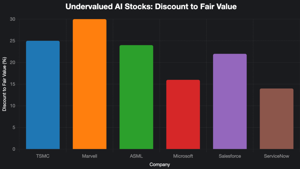 - Undervalued AI plays span three buckets: hardware (TSMC, Marvell, ASML), platforms (Microsoft), and AI users (Salesforce, ServiceNow)—each flagged at ~14–30% discounts.