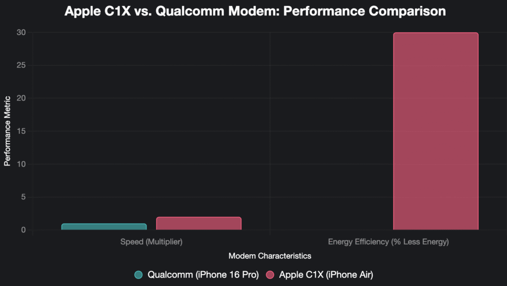 Don’t forget the C1X modem, exclusive to the iPhone Air. An upgrade from February’s C1 in the iPhone 16e, it’s twice as fast as its predecessor and 30% more efficient than Qualcomm’s modem in the iPhone 16 Pro for sub-6GHz 5G. No mmWave yet (that’s for U.S. Pro models with Qualcomm), but for everyday global users, it’s a battery-life hero in a phone that’s already pushing limits.