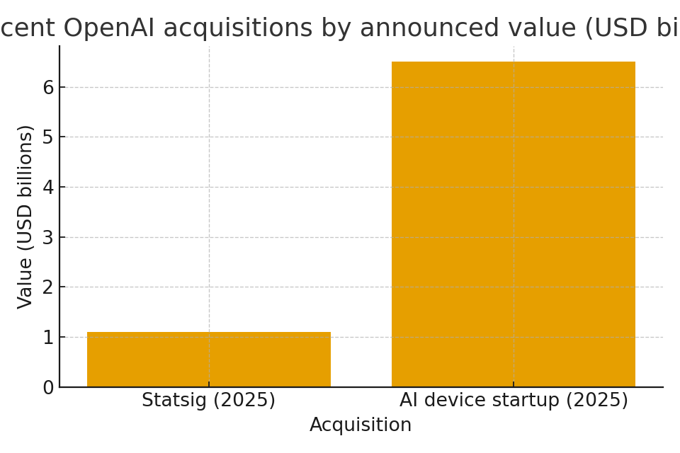 - $1.1B all‑stock acquisition of Statsig (product experimentation & A/B testing) to accelerate OpenAI’s app and enterprise roadmap.