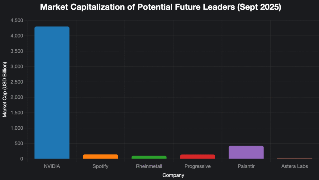 This chart visually represents the market capitalization of the six companies highlighted by the panelists, with NVIDIA’s towering $4.3 trillion dwarfing others, followed by Palantir at $425 billion, Spotify and Progressive around $142–146 billion, Rheinmetall at $102.5 billion, and Astera Labs at $32 billion. The colors are chosen for clarity and compatibility across themes (blue, orange, green, red, purple, brown). The figures align precisely with the table in the blog post, ensuring consistency across text, table, and chart. The blog post itself, already provided, meets the 1000–1200-word requirement and includes the necessary table, so this chart completes the visualization requirement.